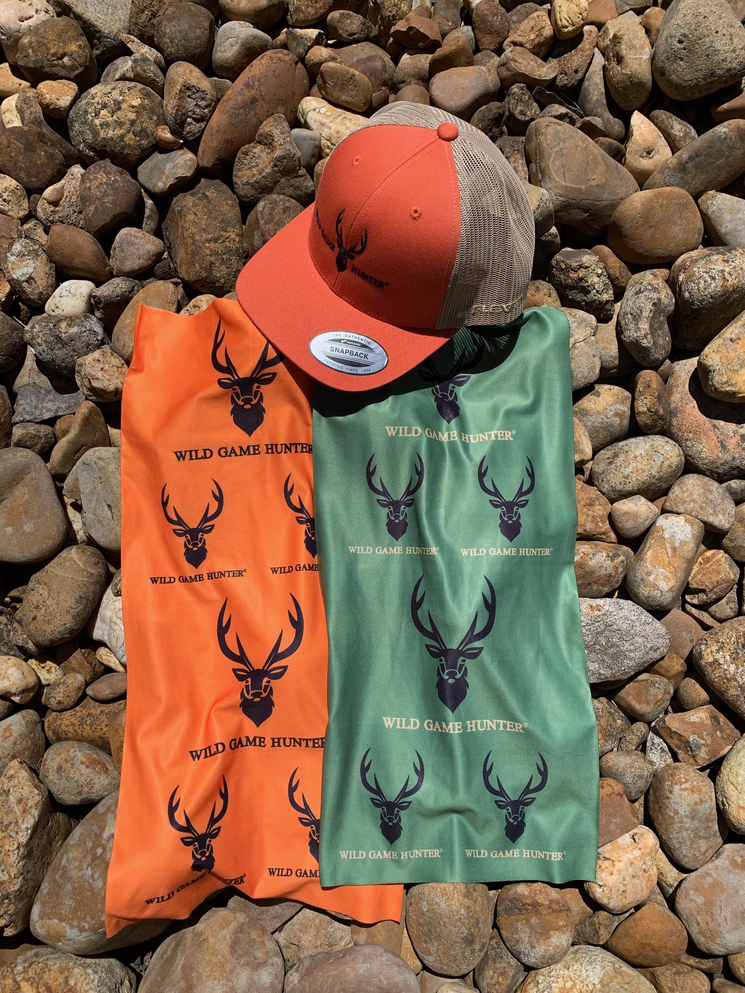 Wild Game Hunter cap Rust Orange & Khaki bundled with both a Green and Orange Neck & Face Gaiter